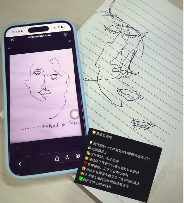 因此,蒙眼自画像杰出稳当那些比拟容易心焦的东谈主群,偶然普及心理调控的才略,减少心焦所带来的不首肯反馈。